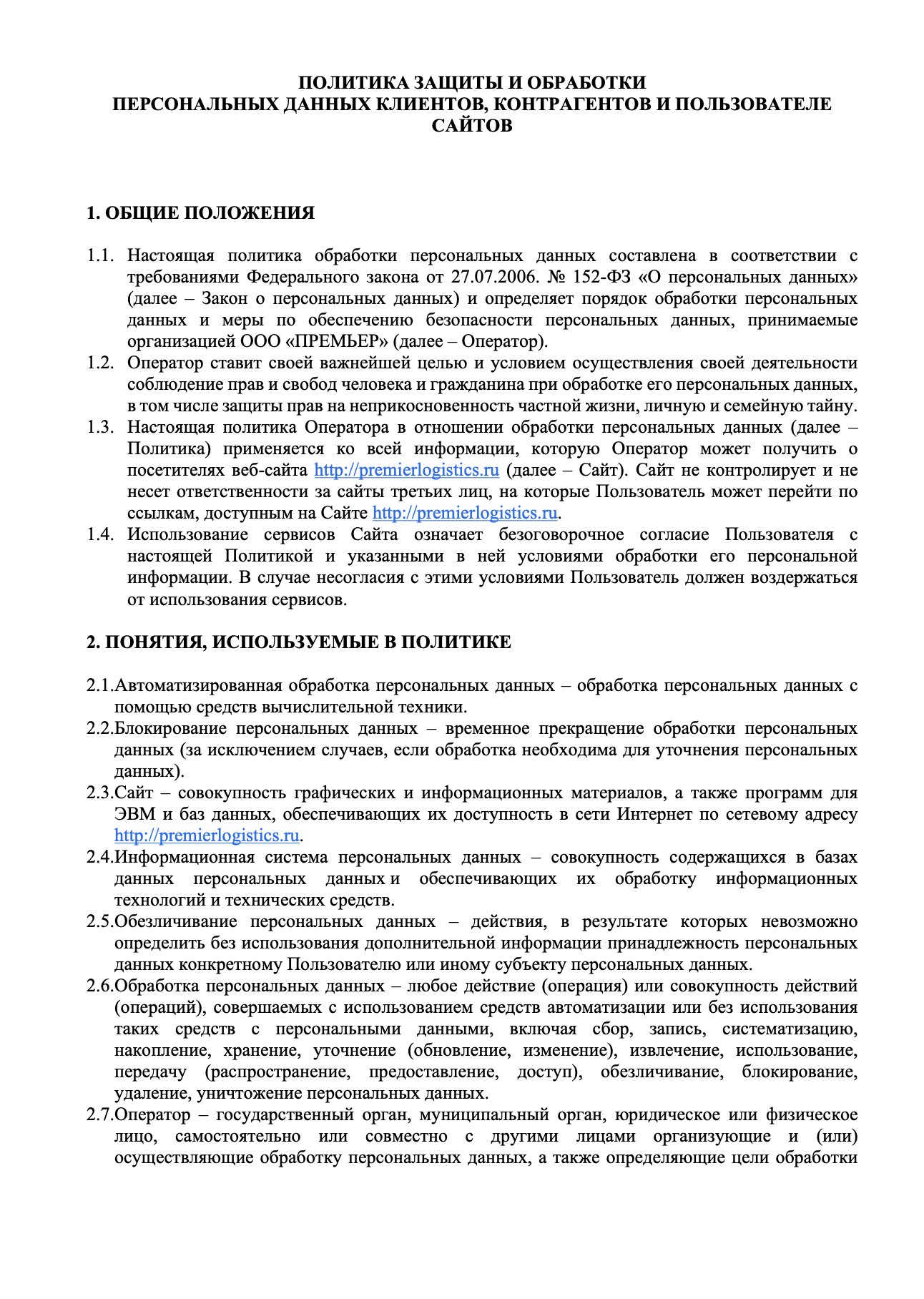 1. Политика защиты и обработки персональных данных клиентов и контрагентов ООО "Премьер"